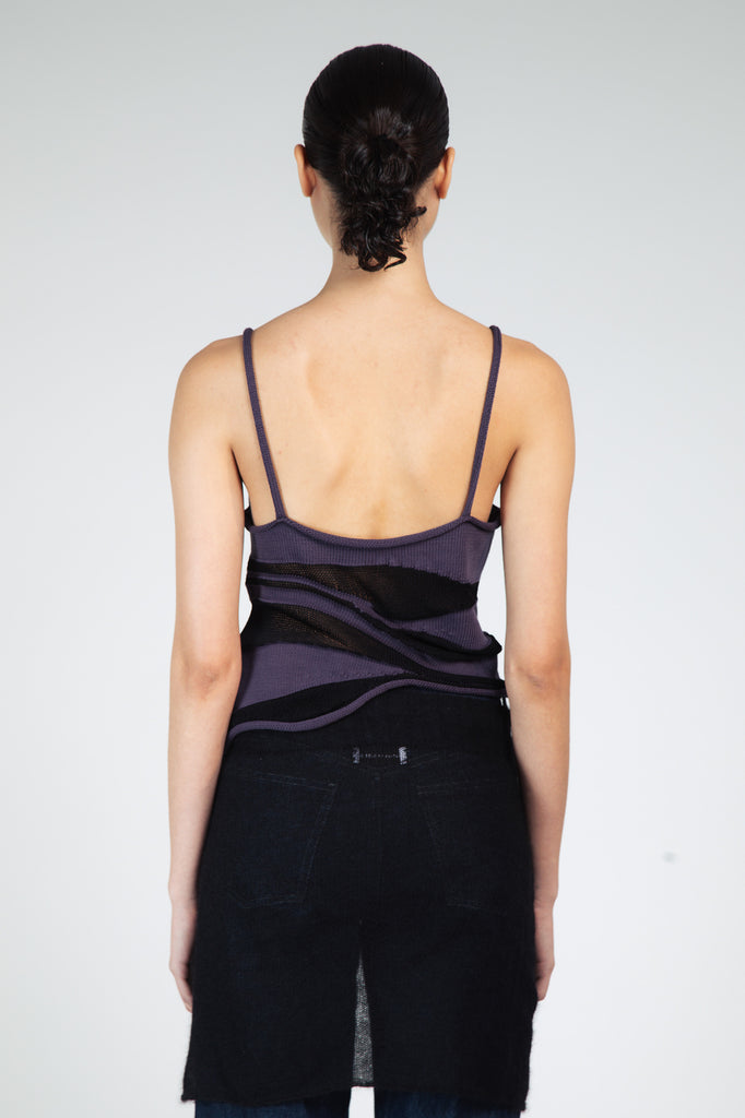 the amorphous top is knitted from a cotton-viscose blend. the organic knitted shapes create a playful, moving texture.