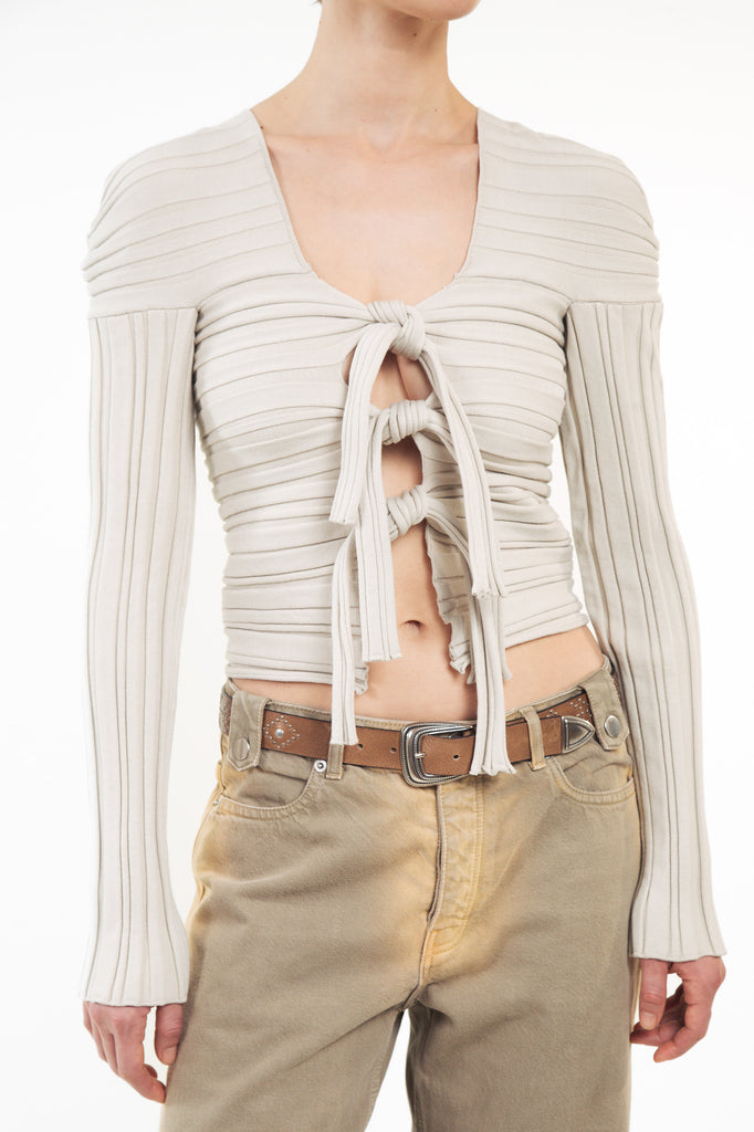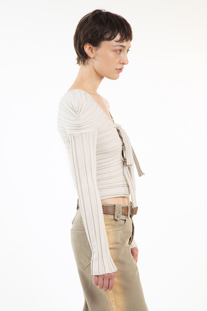 the corpus cardigan is one of our signature pieces, designed in a ribbed knit structure that moulds beautifully to the body for a flattering, body-hugging fit. the three knotted ties can be easily adjusted for a customizable fit.