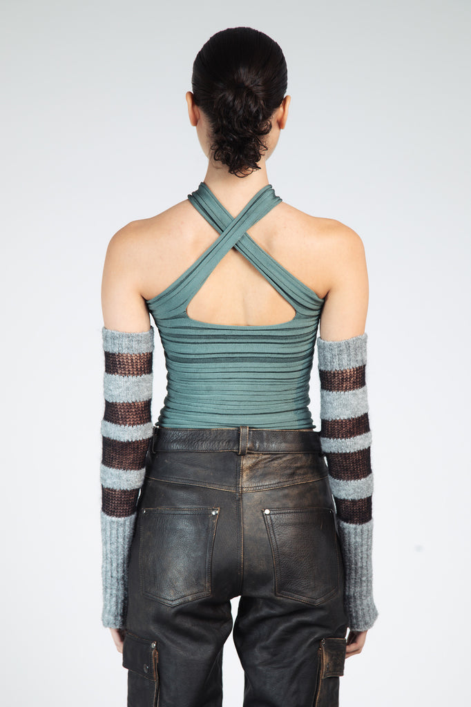 the corpus top is one of our bestsellers. the knitted structure with its viscose/lycra blend, molds beautifully to the body. the ribbed structure creates a body-hugging effect.