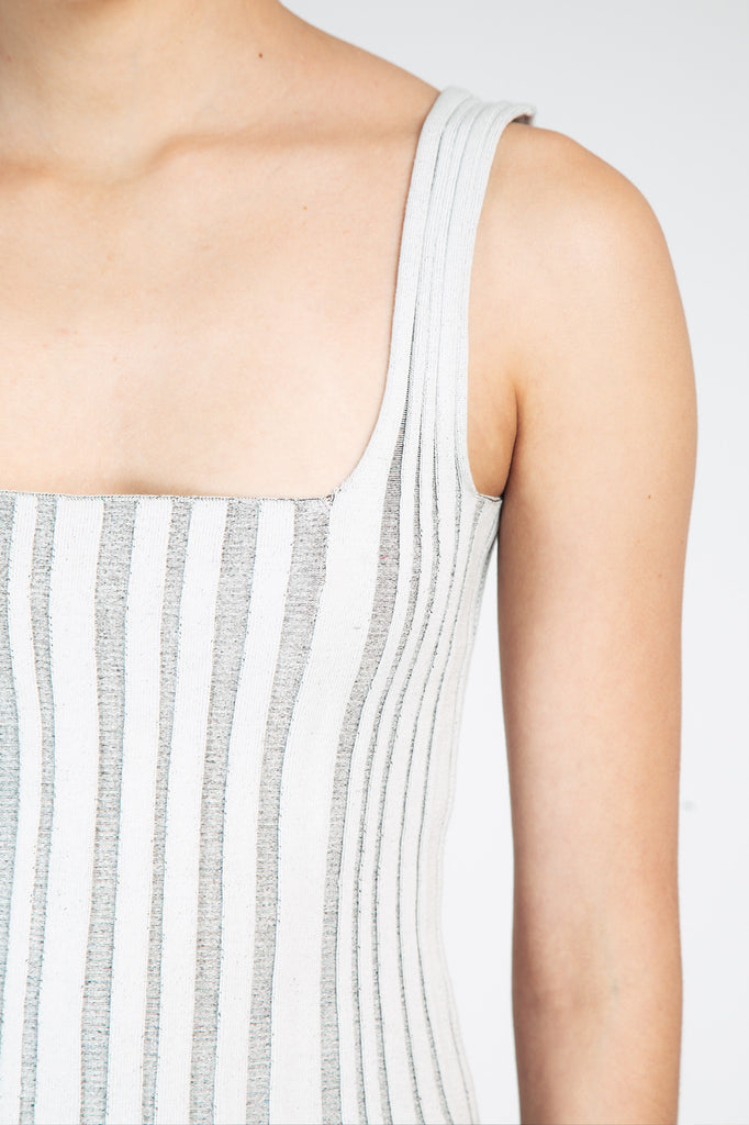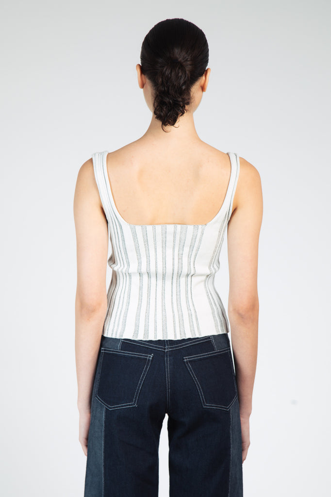 the corset tank is knitted in a cotton/lycra blend. the ribbed structure creates a body-hugging effect.