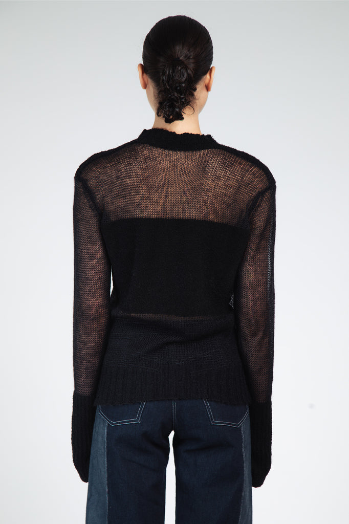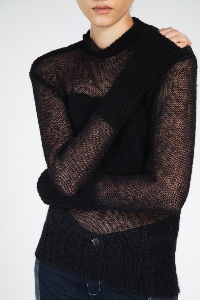 the mirage pullover is knitted from a blend of mohair and bouclé. The cuffs have a slit for the thumb.