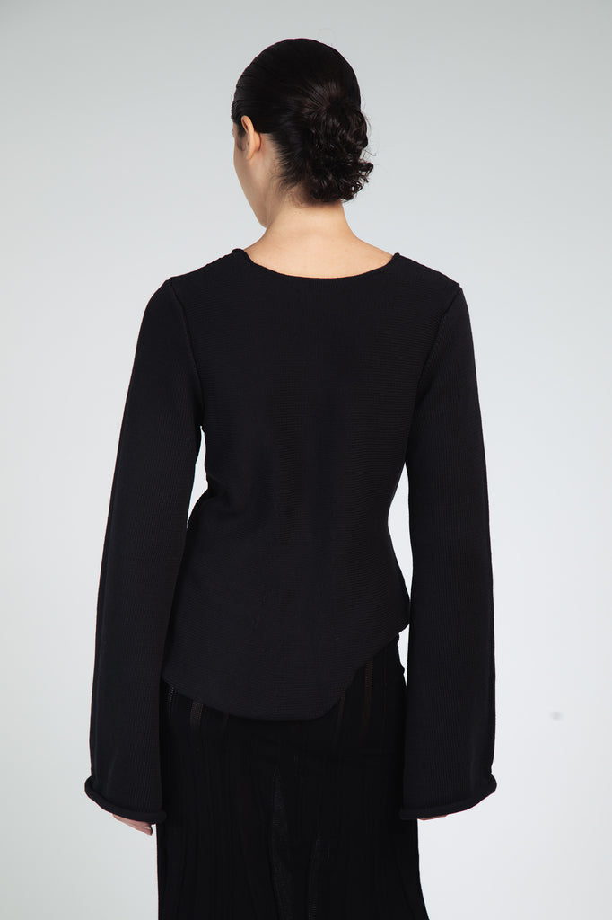 the tulip longsleeve is knitted from a cotton-nylon blend. it has knit-in darts at the waist and an irregular shaped edge at the bottom. the pullover has trumpet sleeves.